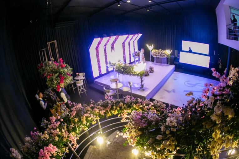 DISPOMOS DE UM AMPLO SALÃO CLIMATIZADO, DECORADO COM UMA ESCADA DESLUMBRANTE, MOBILIÁRIO EXCLUSIVO, MEZANINO, SUITE PARA NOIVAS, SALA PARA FORNECEDORES, ACESSO FACILITADO E UM LINDO JARDIM GRAMADO IDEAL PARA CERIMÔNIAS.